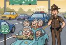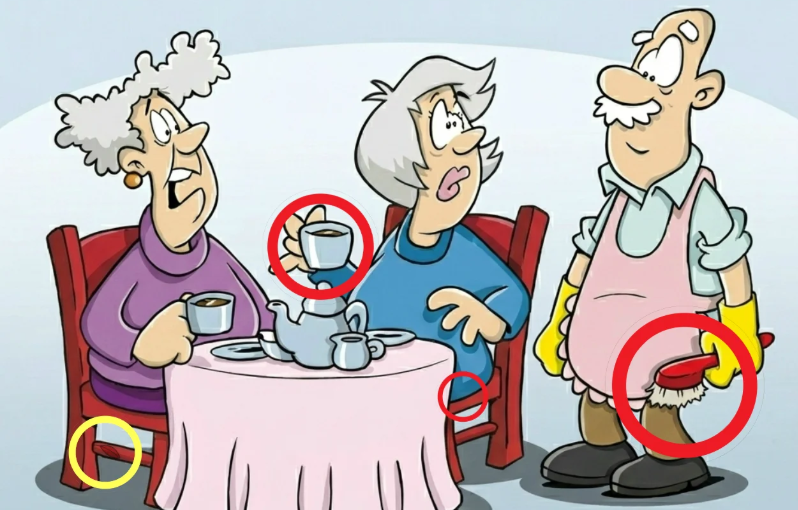 At first glance, this cheerful cartoon scene feels harmless and straightforward. Three elderly friends sit around a small round table enjoying tea. One woman lifts her cup mid conversation. Another listens with a skeptical expression. A man stands nearby wearing gloves and holding a brush. The setting feels warm, familiar, almost cozy.