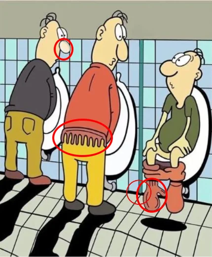 Public restrooms are spaces we all share, yet they often become stages for unspoken social rules, awkward moments, and unexpected humor. This cartoon perfectly captures one such humorous and relatable situation—a man who, instead of standing at the urinal like everyone else, is sitting down with his pants down, causing surprise and amusement among others. It’s a funny twist that invites us to reflect on public etiquette, human behavior, and the comic side of daily life.
