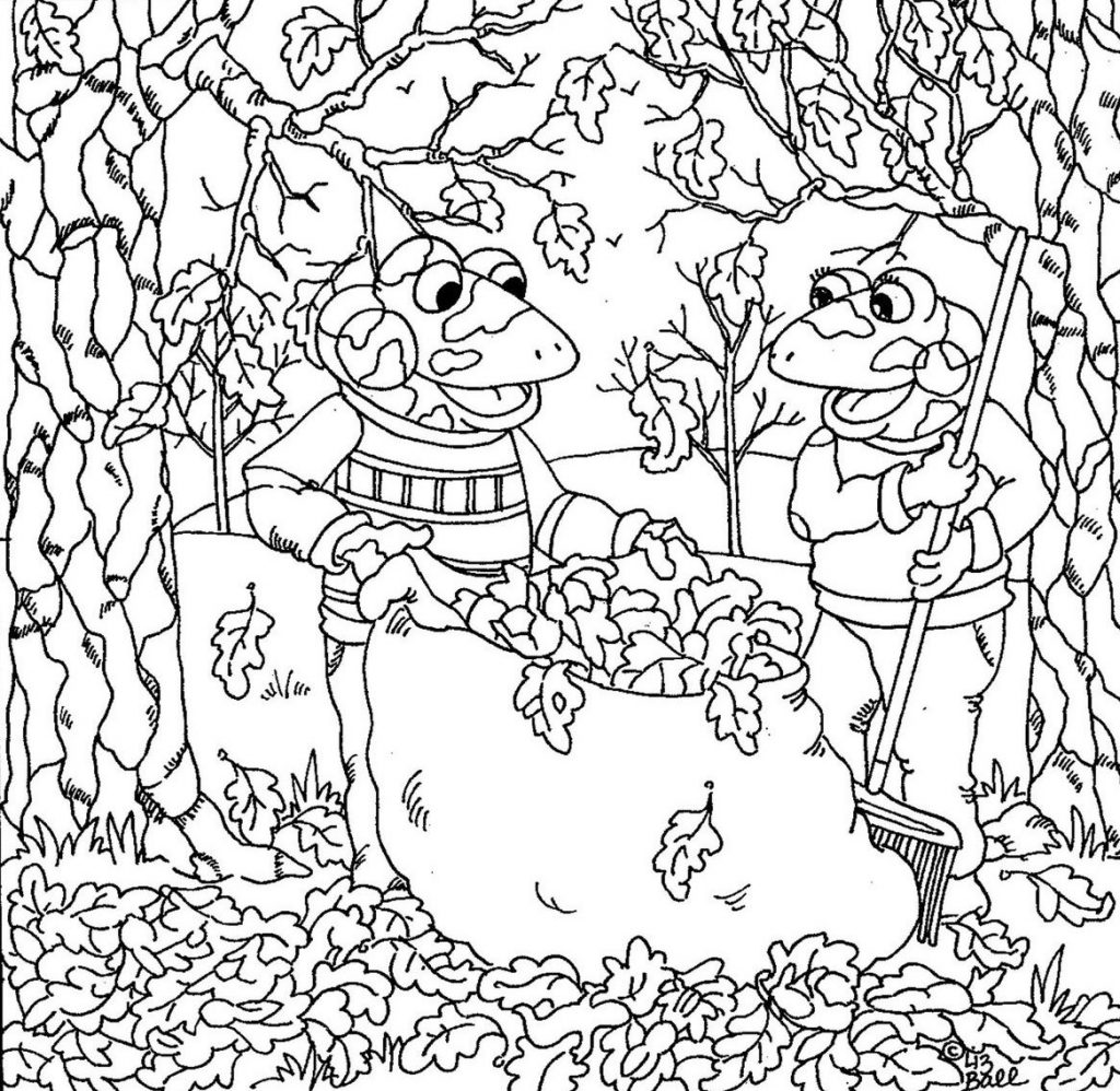 In the heart of a wooded grove, two cheerful frog friends stand surrounded by heaps of leaves. One holds a rake, while the other stuffs leaves into a large sack, their expressions glowing with satisfaction. The forest around them hums with life — textured bark, swirling branches, and layers of fallen foliage create a scene that feels both serene and alive.