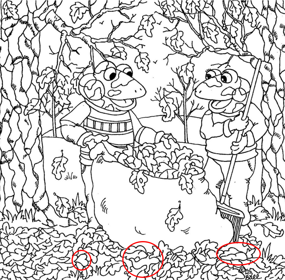 • Zoom in on details.Pay special attention to overlapping elements like leaf piles or tree trunks.