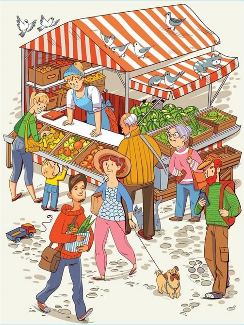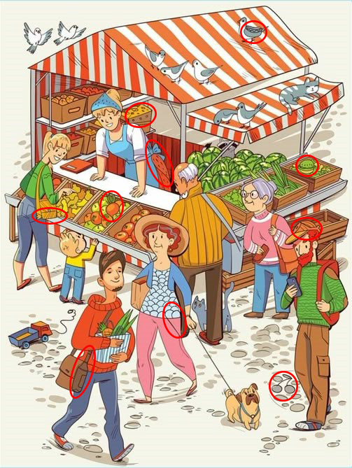 In the farmers’ market scene, a wealth of colorful objects and bustling activities create a dynamic environment. Let’s take a deeper look at the key elements of this picture and some of the hidden items you might find along the way.