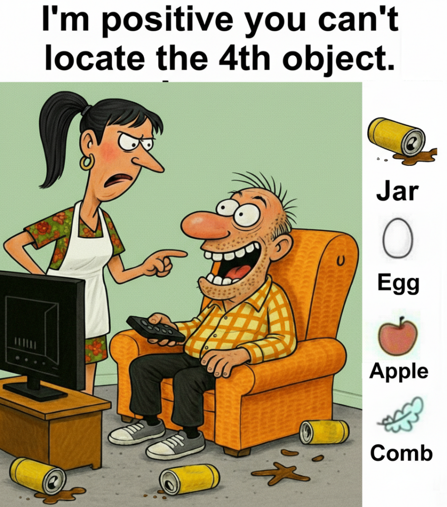 This is not just a funny domestic cartoon. It is a hidden object puzzle designed to challenge your observation skills. The headline boldly claims: “I’m positive you can’t locate the 4th object.” That single sentence transforms a lighthearted scene into a visual brain teaser.