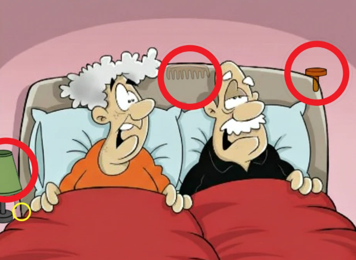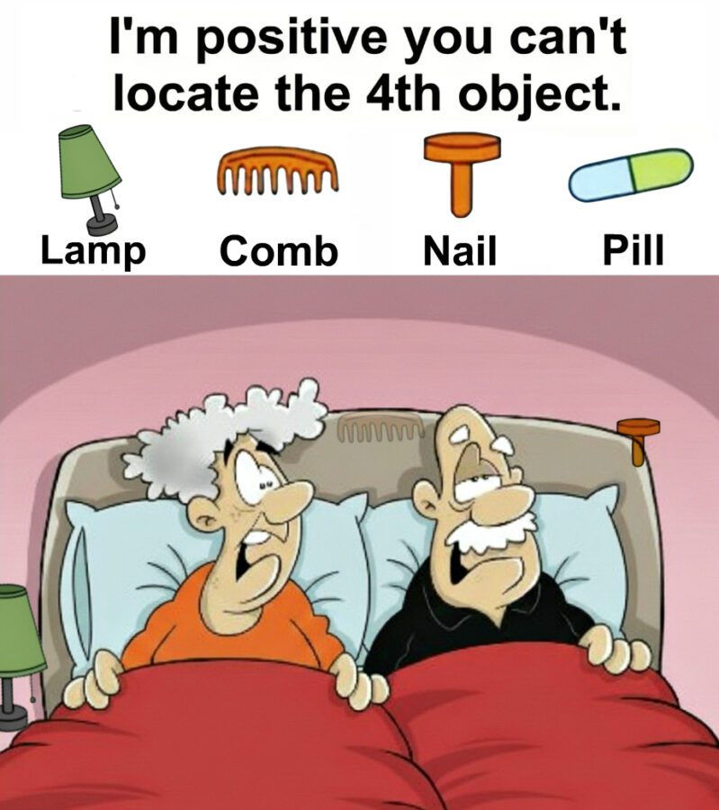 Find Lamp, Comb, Nail, Pill.