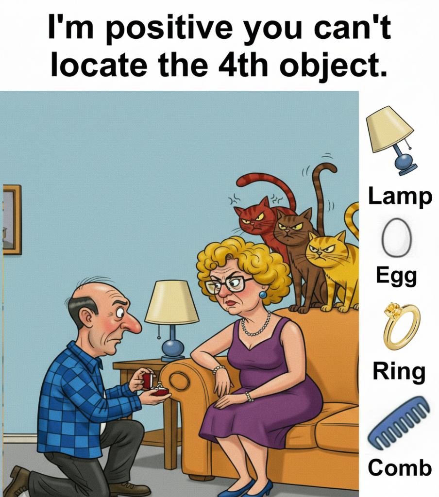 The challenge works because our brains love patterns. When we see an illustration, our mind quickly identifies the main elements of the scene. In this case we notice the characters first. We see the man proposing, the woman sitting on the couch, and the cats perched behind her.