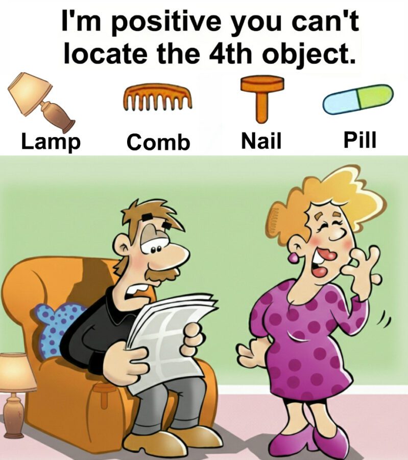 This clever hidden object puzzle transforms a simple living room cartoon into an engaging visual challenge. By asking viewers to locate a lamp, comb, nail, and pill within an ordinary scene, the image pushes us to shift perspective and sharpen our observation skills.