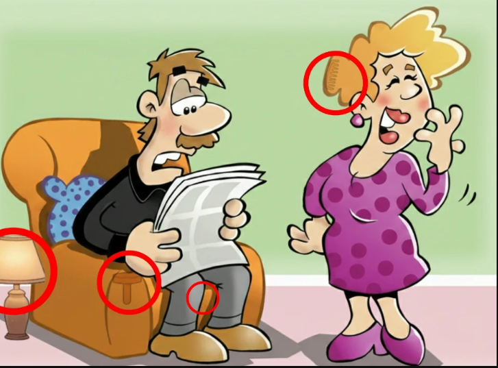This clever hidden object puzzle transforms a simple living room cartoon into an engaging visual challenge. By asking viewers to locate a lamp, comb, nail, and pill within an ordinary scene, the image pushes us to shift perspective and sharpen our observation skills.