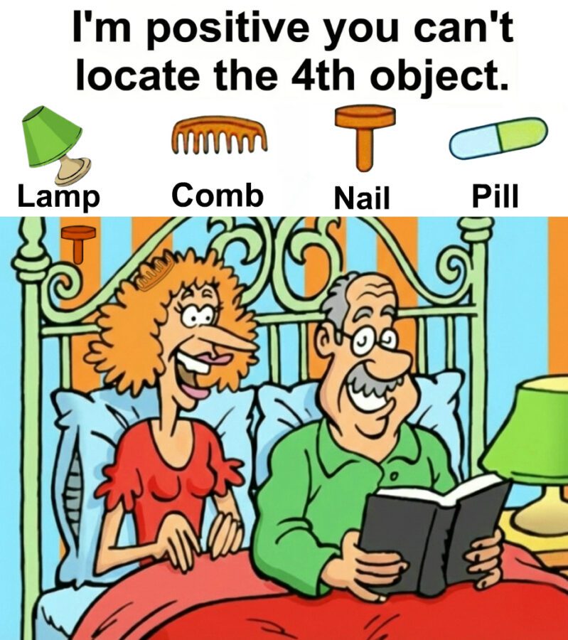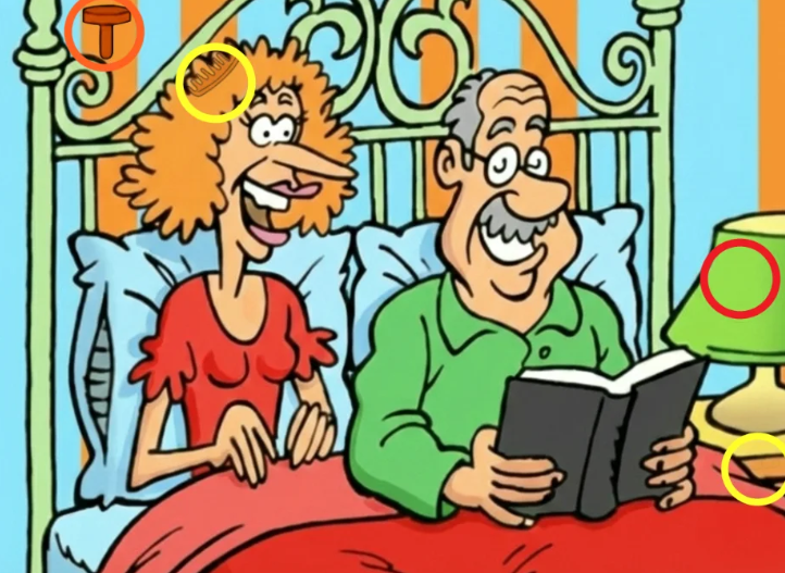 This clever hidden object puzzle transforms an ordinary bedroom scene into a fascinating visual challenge. Within the playful illustration of a smiling couple relaxing in bed, four objects are carefully concealed: a lamp, comb, nail, and pill.