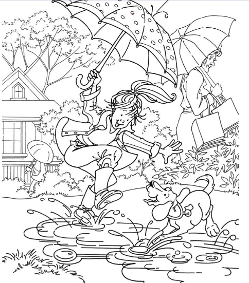 Nothing says pure childhood bliss like the thrill of splashing through puddles under a drizzly sky. In this delightful scene, a carefree youngster armed with a polka-dot umbrella leaps high into a shimmering puddle, while a playful pup bounds alongside, tongue lolling with excitement. In the background, an umbrella-clutching passerby hurries by, and a cozy house peeks through leafy trees. What looks like a simple rainy afternoon transforms into a wonderland of liquid joy and spontaneous fun.