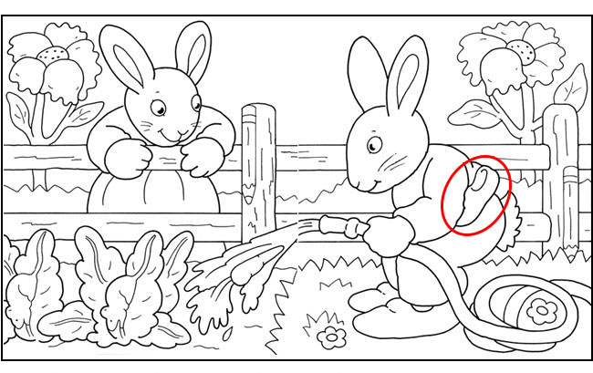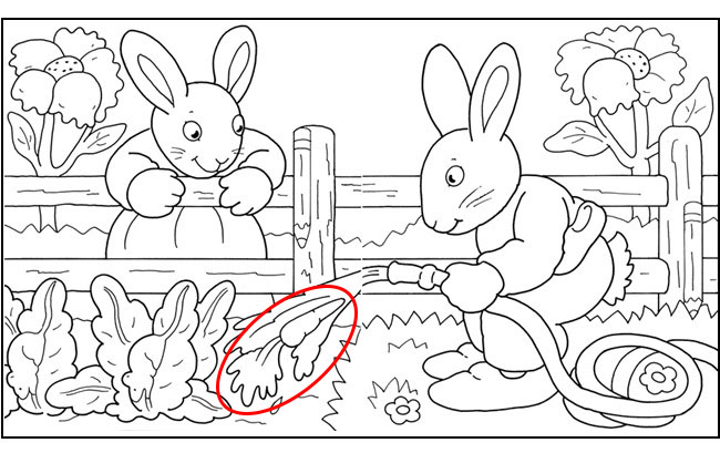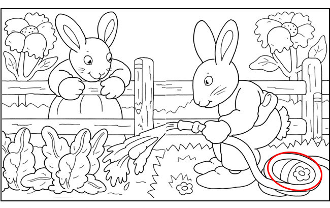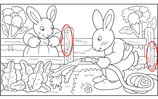 They are both unaware of the hidden objects all around them. Find: 2 ice cream cones, 2 mice, 2 pencils, 1 carrot, 1 slipper and 1 decorated egg.