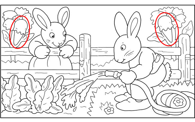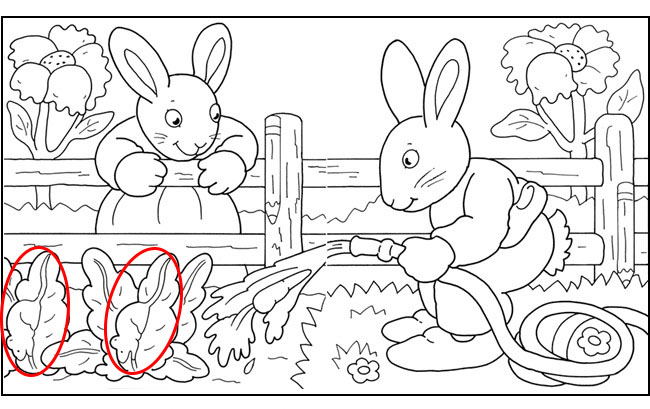 They are both unaware of the hidden objects all around them. Find: 2 ice cream cones, 2 mice, 2 pencils, 1 carrot, 1 slipper and 1 decorated egg.
