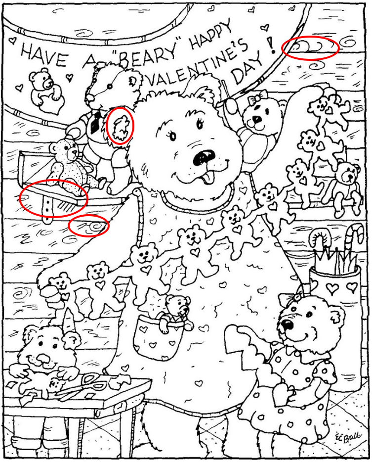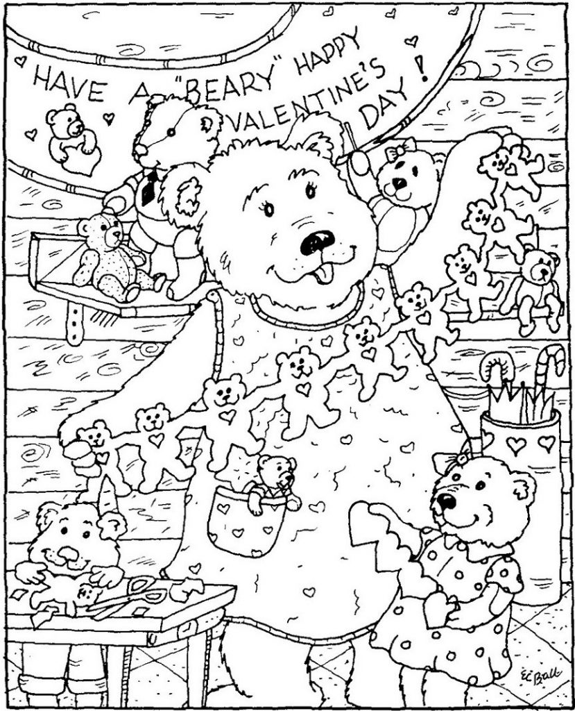 At first glance, the scene shows a warm and cozy setting where bears of all ages are busy making Valentine’s crafts. A large bear, possibly the mother, proudly holds up a string of paper teddy bears with tiny hearts on their chests. Around her, the younger bears are helping—cutting, gluing, and smiling with excitement. Even the details, like candy canes in the corner and teddy decorations hanging on the wall, add to the festive mood. And let’s not forget the banner across the top: “Have a ‘Beary’ Happy Valentine’s Day!”—a playful pun that ties the entire theme together.