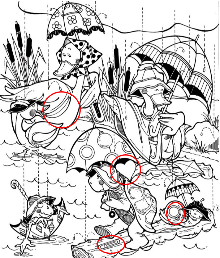 This isn’t just a simple drawing; it’s a playful hidden-object puzzle filled with laughter, umbrellas, and friendship. Let’s dive into this rainy wonderland and uncover the sweet surprises hiding in the details.