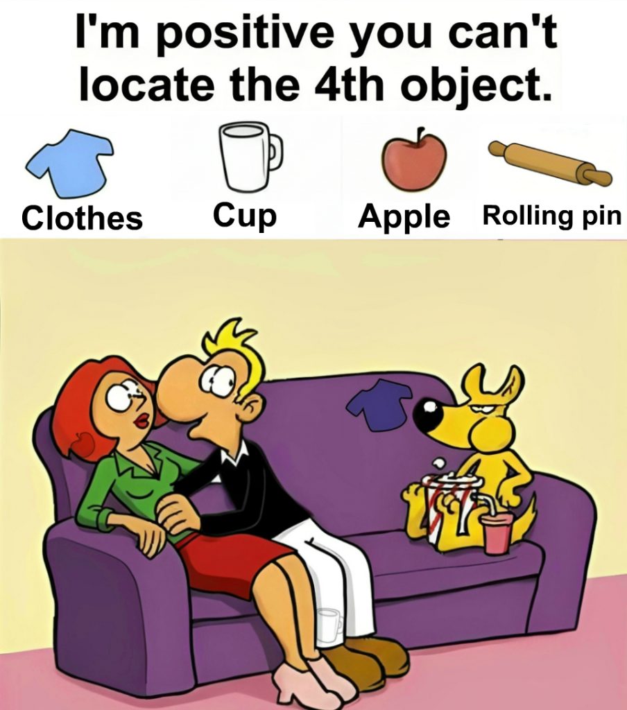 A bold statement challenges you. It claims you cannot locate the fourth object. Four everyday items appear at the top. Clothes. Cup. Apple. Rolling pin.