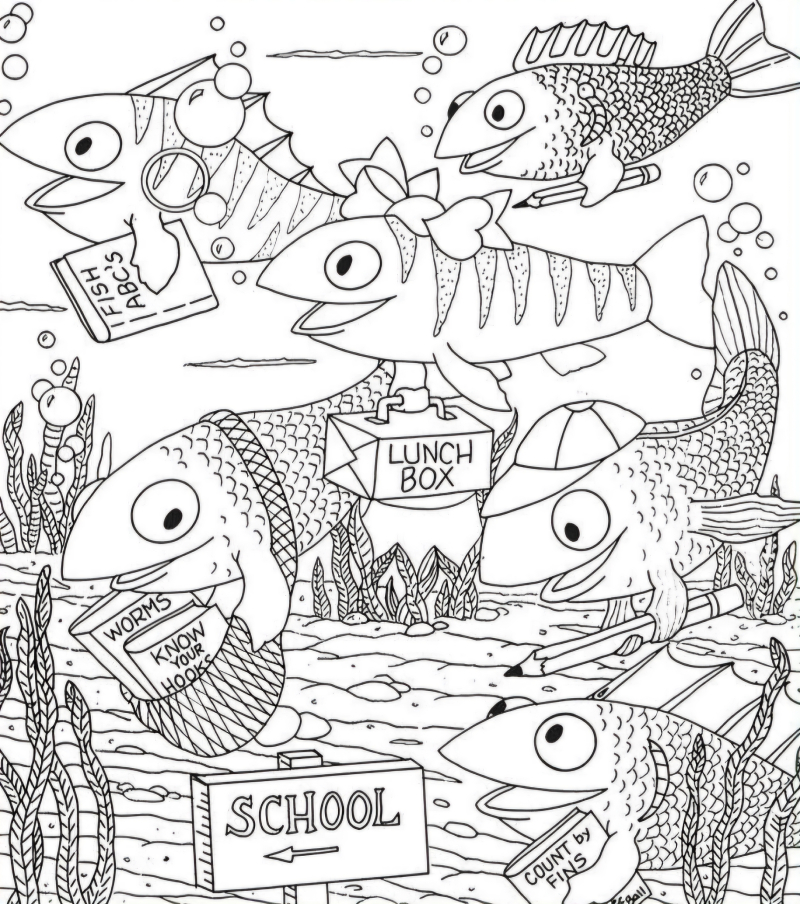 Print the image as a coloring page. Encourage kids to add more silly items: sunglasses, snacks, a blackboard, or even a fish principal!