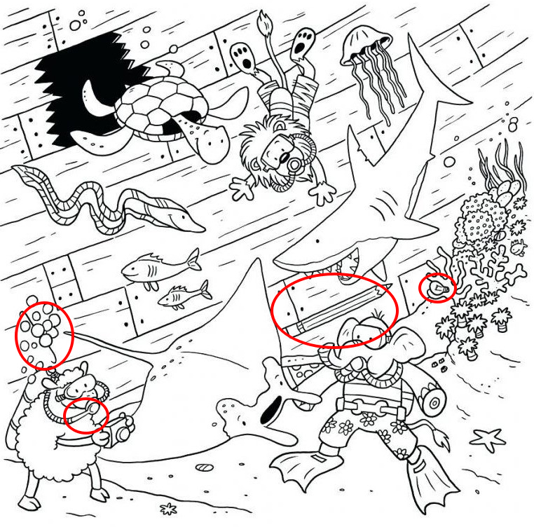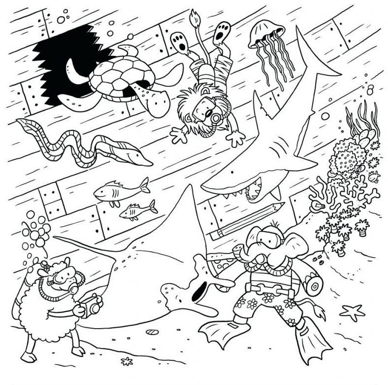 The sheep, looking fluffy even underwater, blows bubbles while snapping underwater photos with a big grin. The mouse, geared up with an oxygen tank and sporting floral shorts, appears to be having the time of his life. Meanwhile, the lion floats nearby, clearly unbothered by the presence of a toothy shark in his vicinity.