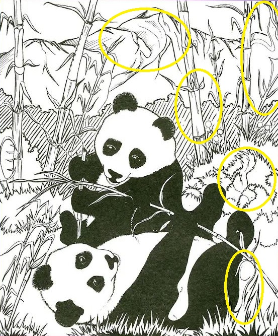 Here below we can see a picture of a forest with two pandas, but somewhere in the picture, there are a Swan, Candle, Chicken, Fish, and Spoon.