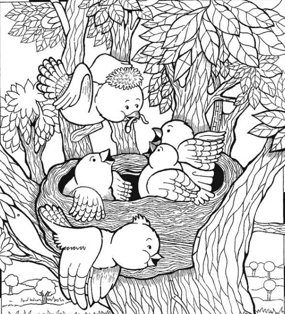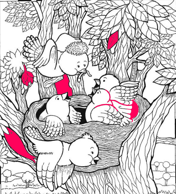 At first glance, the image seems like a simple illustration of a few birds perched around a nest in a tree. But as you take a closer look, you’ll find that there’s more than meets the eye. The scene is teeming with tiny hidden details, each one carefully integrated into the natural setting. From the branches and leaves to the birds themselves, there are several surprises tucked away in the picture, waiting to be uncovered.
