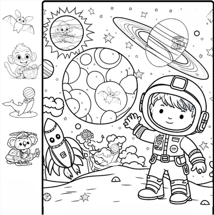 Space has always been a place of wonder—a vast expanse filled with stars, planets, and endless possibilities. But in this playful illustration, the universe has an extra twist: it’s full of hidden surprises. What appears to be a simple coloring page of a young astronaut waving from a distant planet is actually a cleverly designed hidden object puzzle. Each unusual detail blends seamlessly into the cosmic backdrop, waiting for a sharp-eyed space detective to find it.