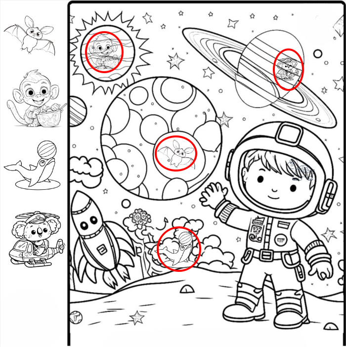 - Look for Theme Mismatches– Objects that don’t fit the “space” theme, like animals or sea creatures, are often the easiest to spot first.