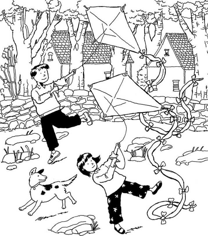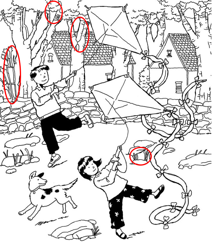 Take a moment to explore the background. The trees behind the children aren’t just scenery — they might hide familiar shapes or patterns disguised as branches or leaves. The stone wall, with its irregular shapes, could conceal unexpected outlines. Even the kites’ ribbons may hold subtle twists that form something more than just fabric flowing in the wind.