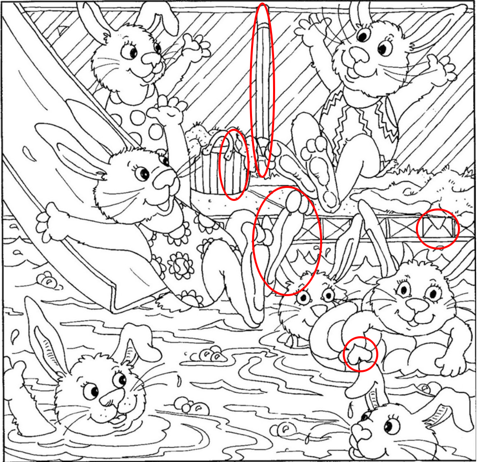 In this picture, the bunnies steal the spotlight. One slides gleefully into the pool, another bounces mid-air, while others lounge or float with inflatable rings. But if you look carefully at their ears, swimsuits, and playful splashes, you may notice more than just cartoon characters. Some of these shapes double as hidden objects, camouflaged to blend with the rest of the scene.
