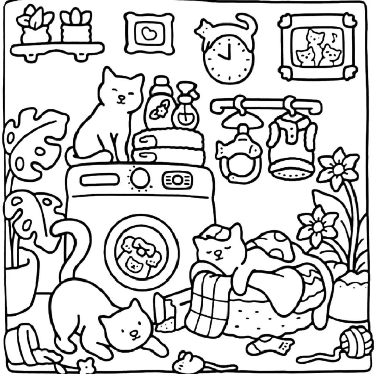 - Color Swap Challenge:After you fill in the cats, challenge each other to recolor only the laundry items in bold, unexpected schemes—electric blue socks, neon pink towels, or patterned detergent bottles.