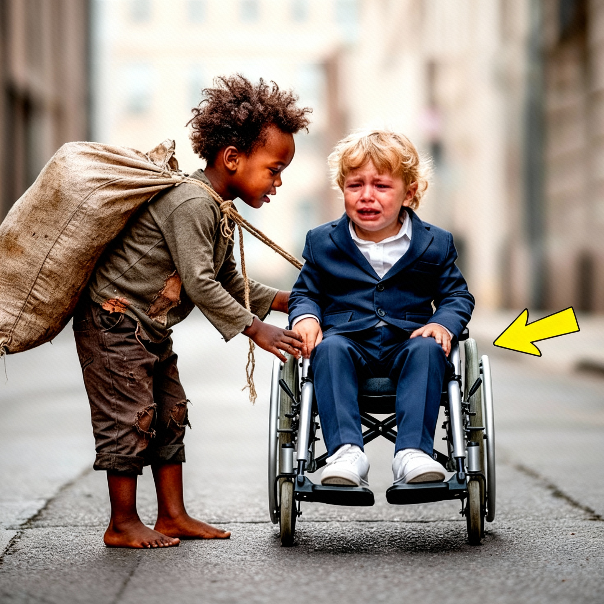 The tiny voice belonged to a barefoot boy standing under the traffic light, shivering in the biting morning breeze. In the backseat of a luxurious SUV, a paralyzed child looked up for the first time that day.