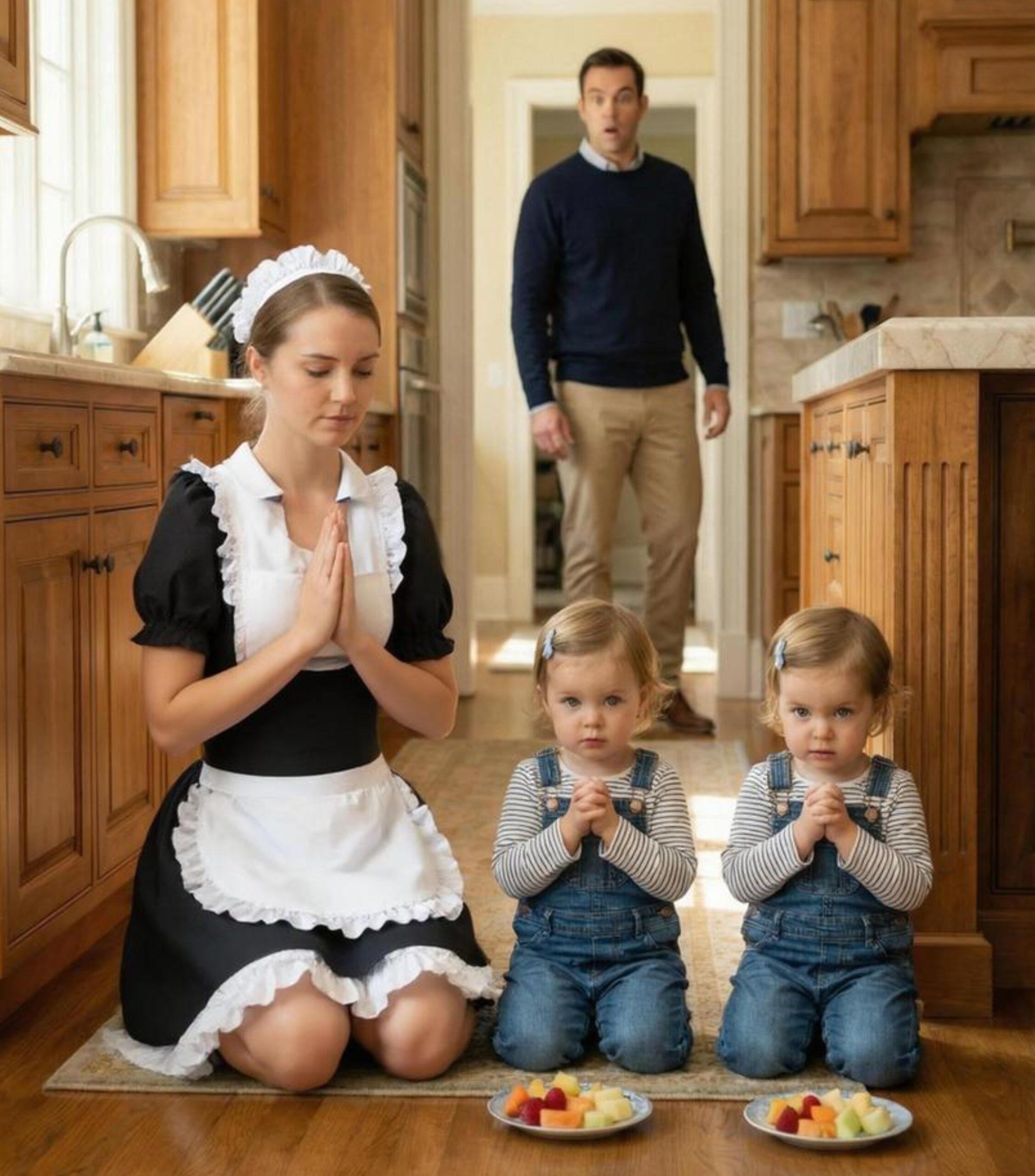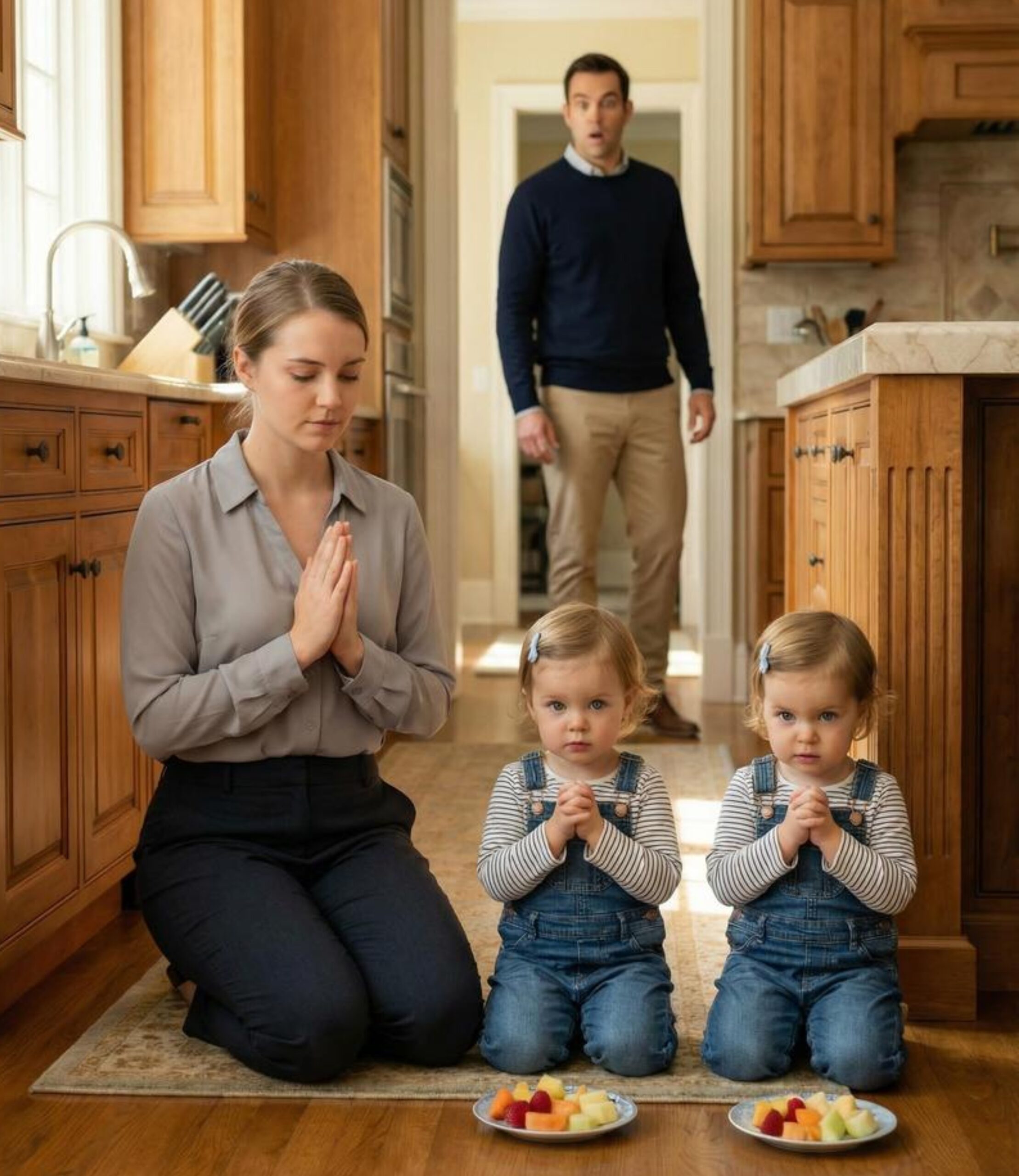 In front of her, sitting on a small rug, were two little girls—twins, no more than two years old. Their hair was neatly brushed, tiny dresses clean but clearly worn. Each of them had their hands clasped just like Maria’s, faces solemn with the kind of seriousness only children have when they’re imitating something sacred.