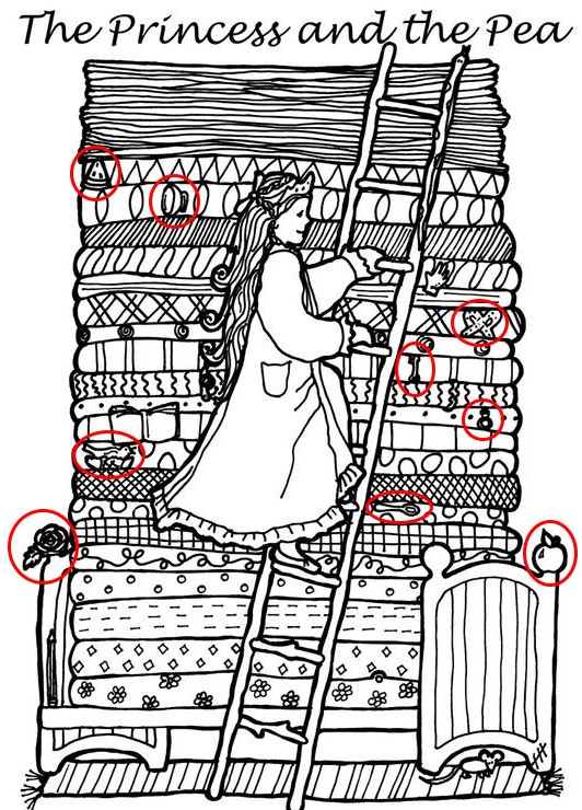 Can you find apple, rose, bird on her nest, spoon, bowl, key, watermelon, pretzel, and ring.