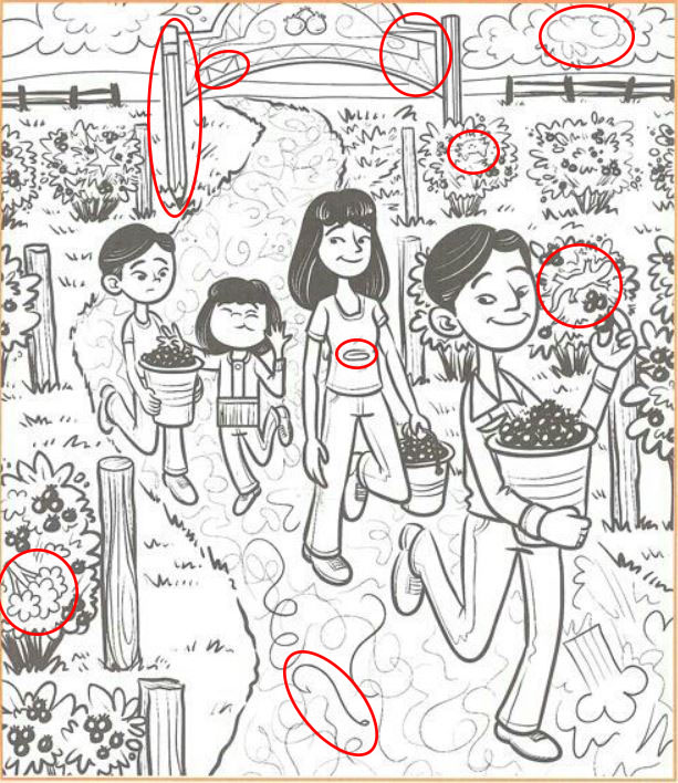 In this picture find: broccoli, cat’s head, lizard, fish hook, paperclip, envelope, pennant, pencil, rabbit.