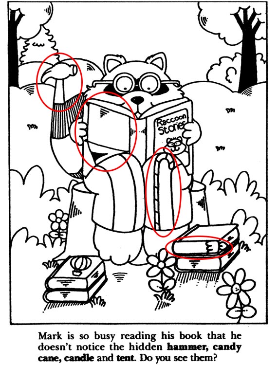 Mark is so busy reading his book that he doesn’t notice the hidden hammer, candy cane, candle and tent.