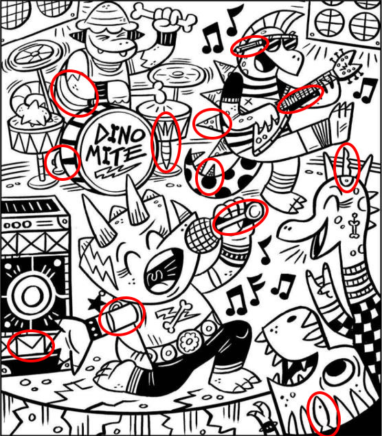 In this picture find: spoon, pencil, hammer, ice-cream cone, mug, carrot, banana, key, slice of pizza, envelope, toothbrush, fish.