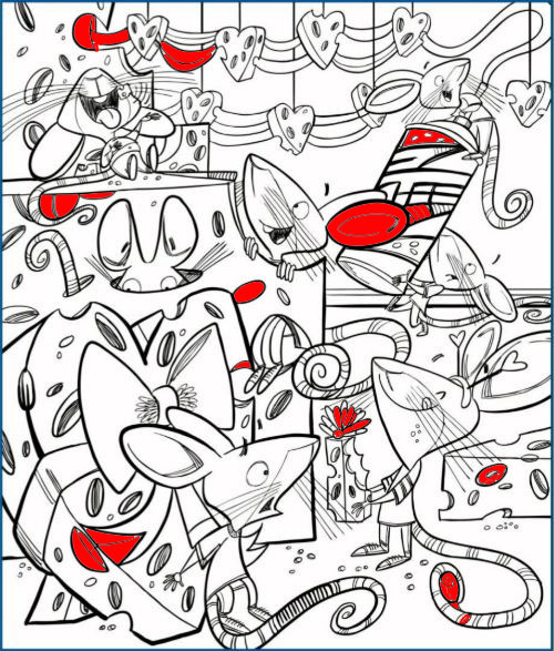 In this picture find: light bulb, banana, baseball cap, slice of pizza, flower, dragonfly, musical note, sailboat, mushroom, doughnut.