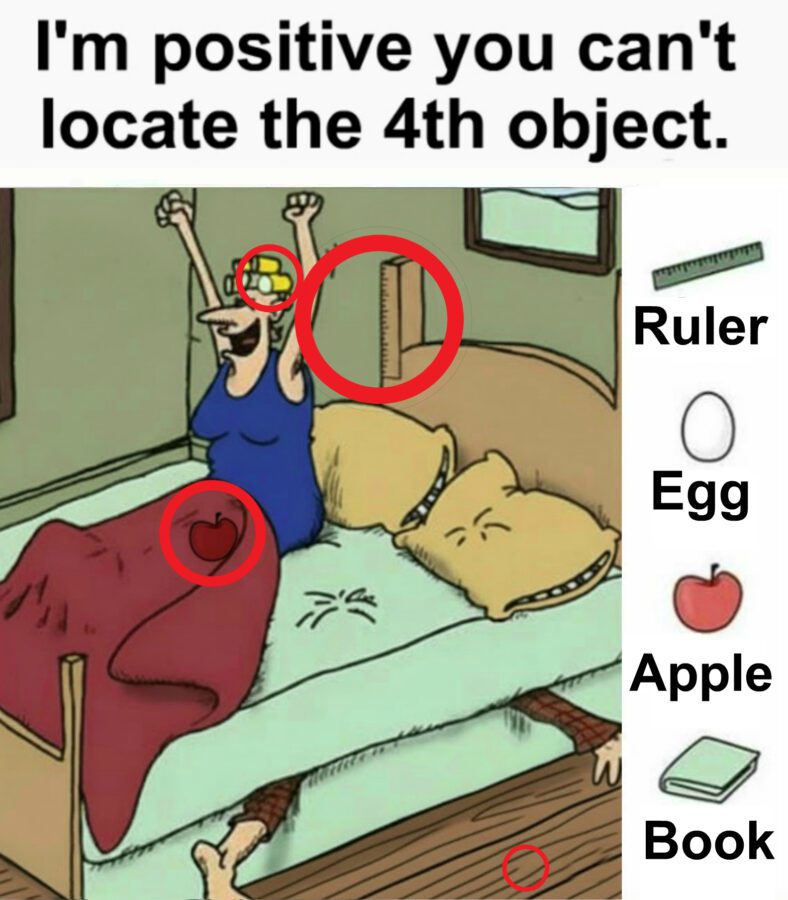 Your brain relaxes when it sees familiar settings. It labels things quickly—bed, blanket, pillow, leg, floor. Once labeled, your brain stops analyzing. And that’s exactly when the hidden objects slip right past you.