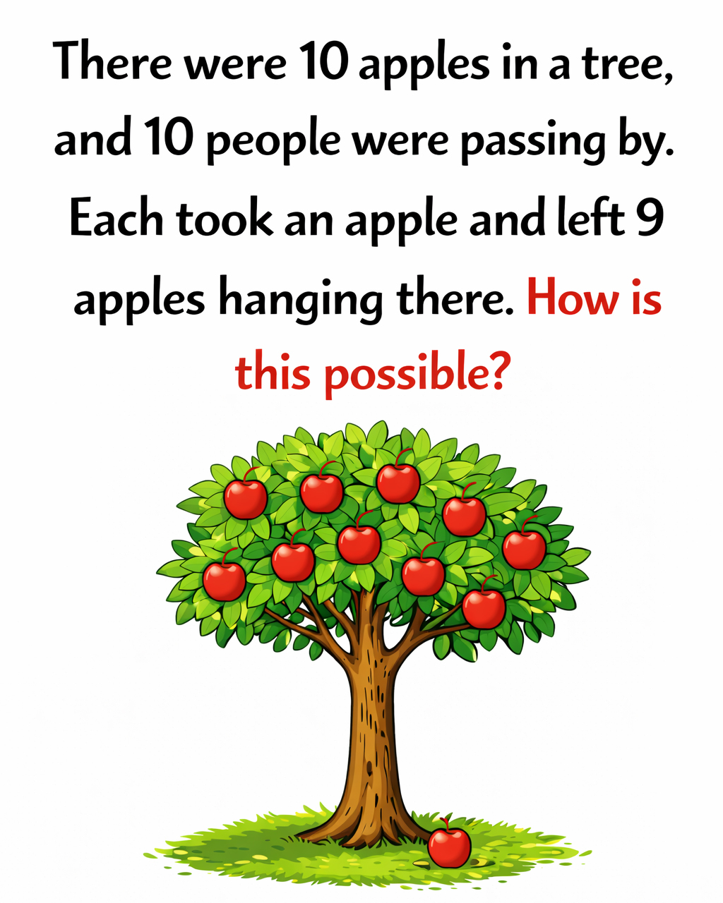 He took an apple from the 10 apples of the tree and left 9 apples hanging there.