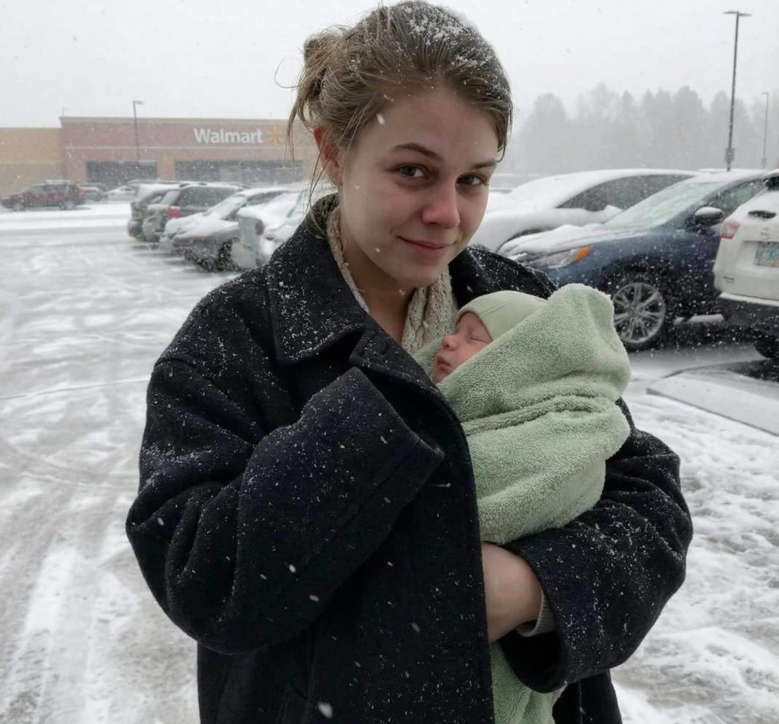 Inside the Walmart café, I bought her a bowl of hot soup and a coffee. She cradled the cup with both hands like it was the first warmth she’d felt in days. The baby slept against her chest, finally shielded from the wind.