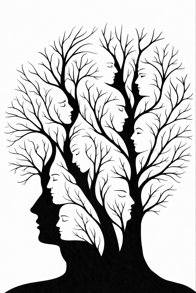 This powerful black and white artwork transforms a simple human profile into a living tree filled with faces. It symbolizes identity, mental growth, emotional complexity, and the deep connections that shape who we are.