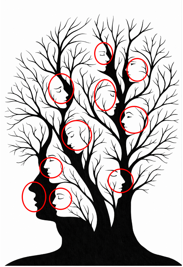 Another powerful theme in this image is connection. Although each face looks separate, they share the same foundation. They are not isolated trees. They are one tree.