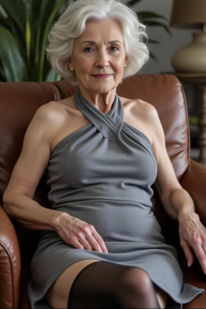 She tried to shift slightly, adjusting her posture as if to hide the subtle swell of her chest beneath the blouse.