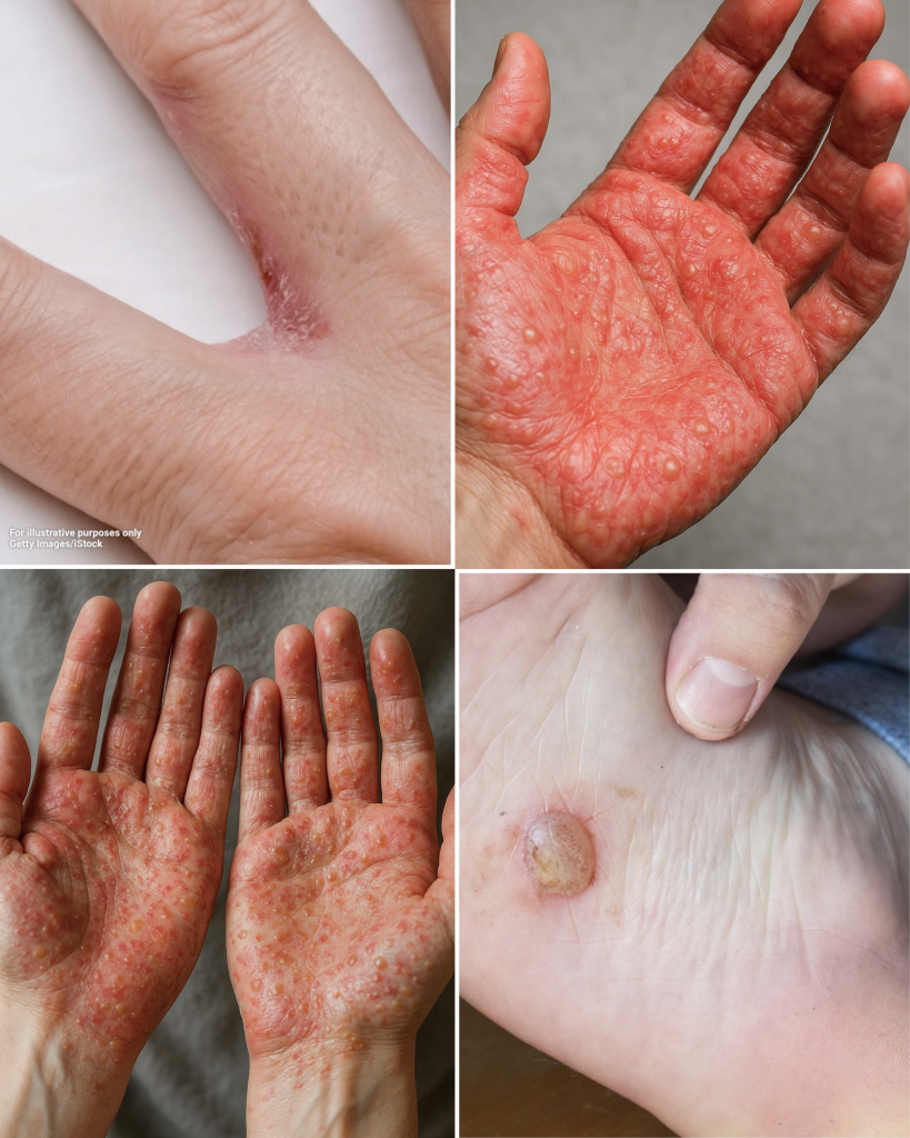 - Deep-seated blisters on the hands and feet, especially along the edges of fingers, toes, palms, and soles