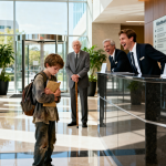 The revolving doors at Lakeshore Plaza spun quietly in the mid-morning light. The marble lobby shimmered like a lake under fluorescent suns. People hurried past with coffees and briefcases, their heels ticking like impatient clocks. Near the security desk, a teenager stood very still, as if afraid the floor might push him away.