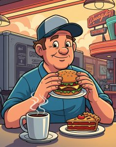 A truck driver stopped at a roadside diner for lunch and ordered a cheeseburger, coffee and a slice of apple pie.