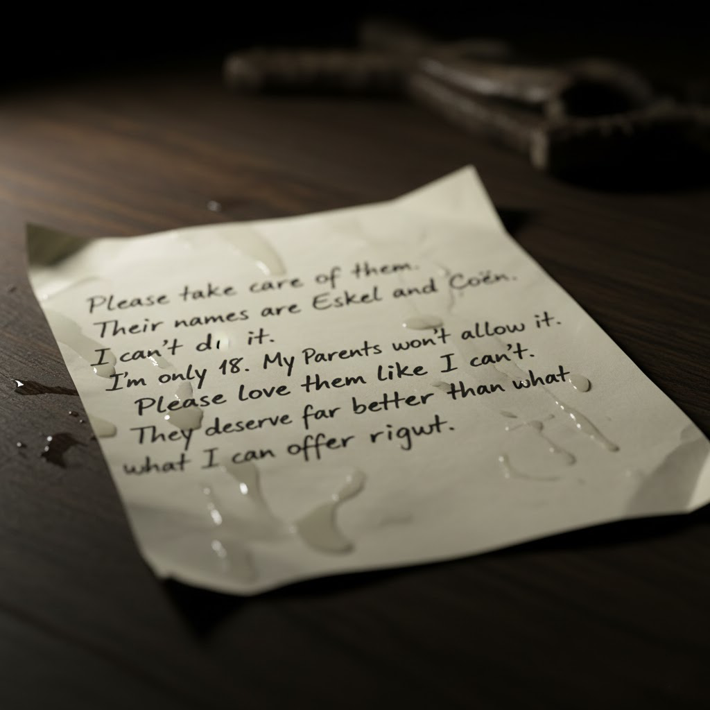 Please take care of them. Their names are Eskel and Coën. I can’t do it. I’m only 18. My parents won’t allow it. Please love them like I can’t. They deserve far better than what I can offer right now.