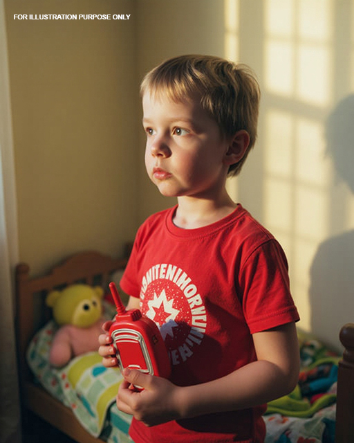 From the bag, he pulled out two toy walkie-talkies. Bright red plastic, oversized buttons, and a crackly speaker.