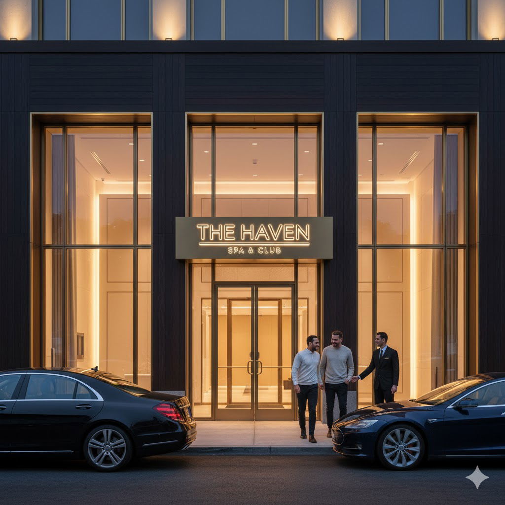 Finally, they pulled into the valet line at a fancy new building I’d never noticed before. It had gold trim and soft light pouring out onto the walkway. The sign read: The Haven Spa & Club.
