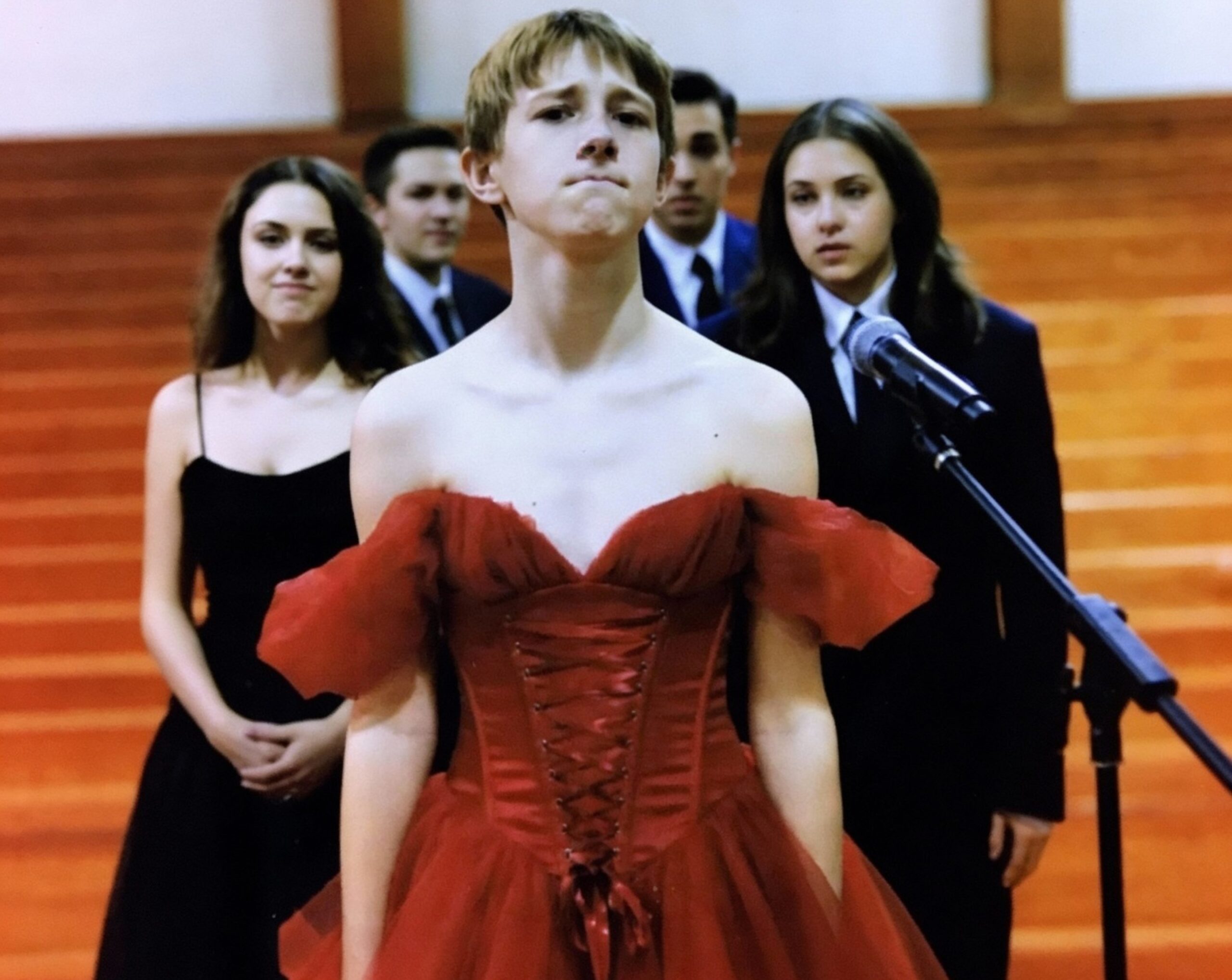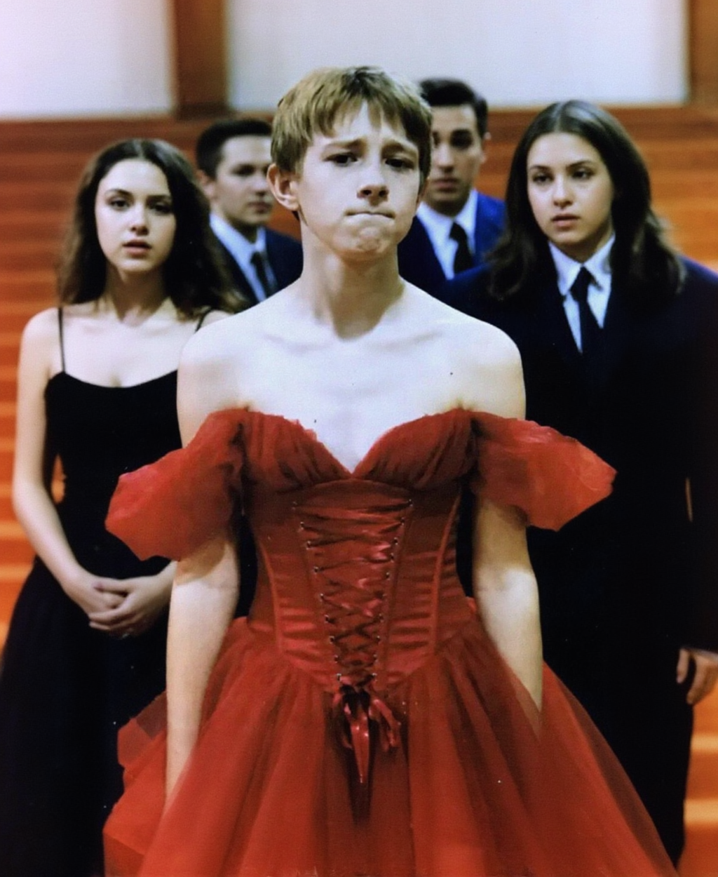 Liam walked through the doors wearing a flowing red dress that shimmered under the auditorium lights.
