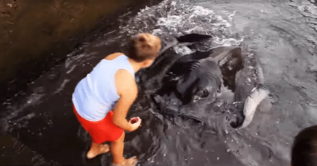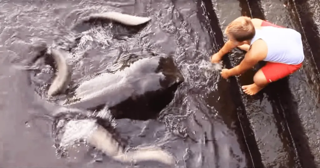 You could almost be forgiven for thinking the couple was welcoming each other tenderly and enjoying each other’s company. While the child fed the ray, the trusting creature fluttered its enormous wings, attempting to get even closer to him.
