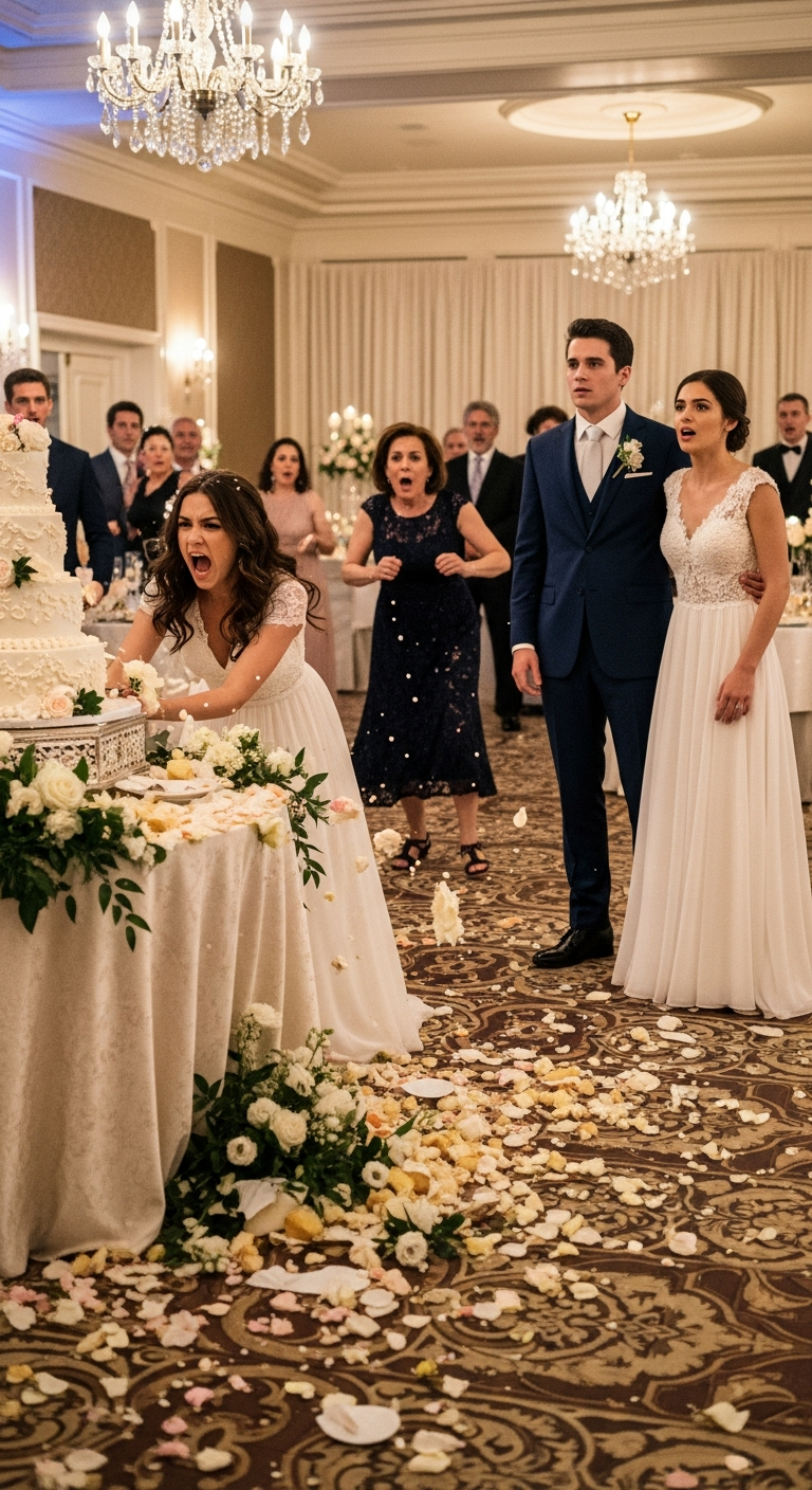 Then she threw it. The champagne flew in a perfect arc and exploded against the dessert table, shattering a photo frame of me and Emily smiling on a cliffside in Maui. Then she grabbed the wedding cake and shoved it like she was flipping a table. The cake didn’t just fall, it collapsed. Three layers, delicate sugar work, custom flowers, all smeared across the floor. She looked me dead in the eye and screamed it loud enough for people outside the venue to hear: