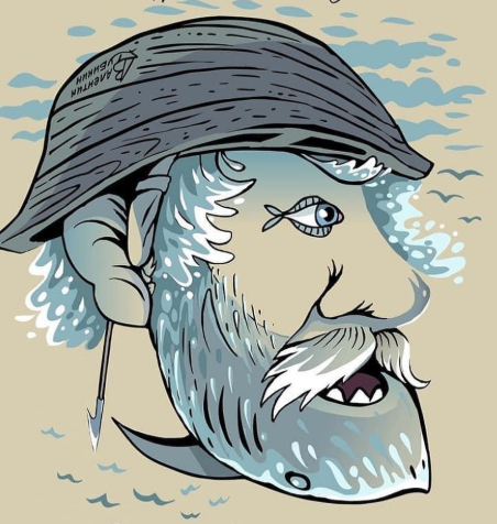 From afar, you’re greeted with the profile of a grizzled old fisherman, complete with a weathered expression and a salty beard. But take a closer look. His helmet? It’s not just a helmet—it’s a boat riding waves. His ear? It’s shaped like a curled-up fish. Even his eyes and beard morph into elements of the ocean, from schools of fish to foamy waves.