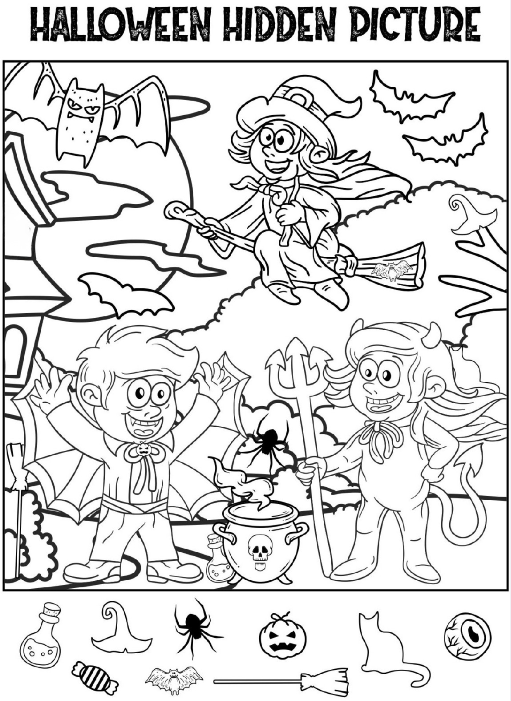 The backdrop sets the perfect Halloween tone. A full moon lights up the night sky, bats flutter through the air, and a haunted house peeks from the side, adding a dash of eeriness. But there’s no real fear here—just fun. The wide grins on the children’s faces remind us that Halloween is more about excitement and play than genuine fright.